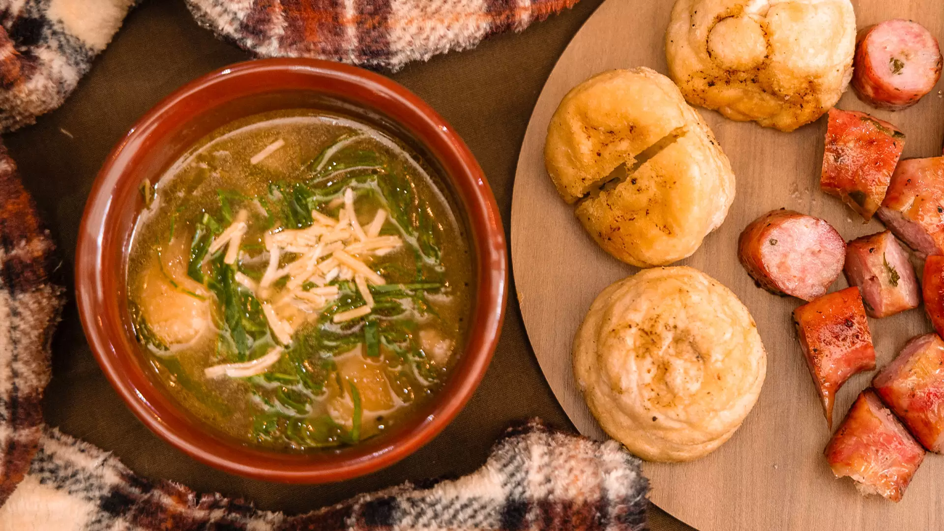 Venha aprender a fazer um delicioso caldo verde com linguiça, acompanhado do Pão de Alho Santa Massa!
