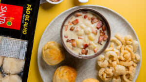 Sopa de Batata com Bacon, acompanhada de Pão de Alho Bolinha Santa Massa e Torresmo