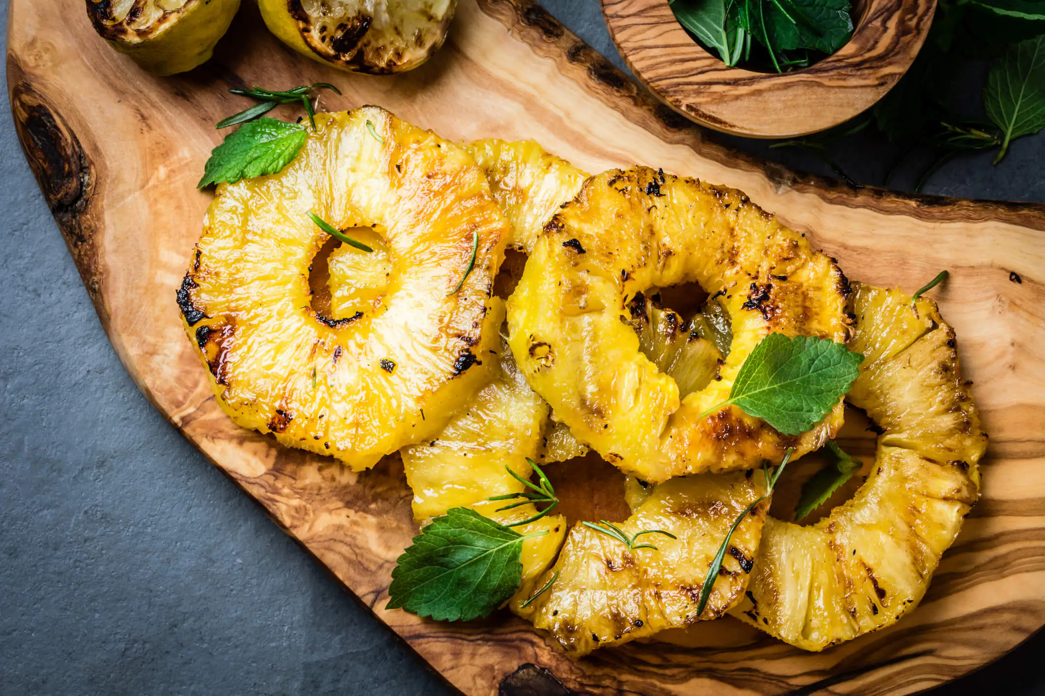 O abacaxi grelhado é simples de fazer, mas tem um resultado surpreendente: além de ser saboroso, ele ajuda o estômago e o intestino na digestão de alimentos, devido às suas propriedades ácidas. Você pode colocá-lo na churrasqueira com casca. Desse modo, o suco e o aroma são mantidos. Também é possível assá-lo no espeto.