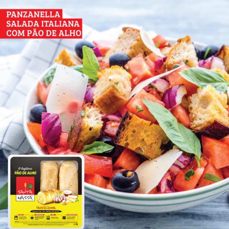 Confira a receita de Panzanella, uma salada italiana que fica ainda mais gostosa combinada com o nosso Pão de Alho Santa Massa:13