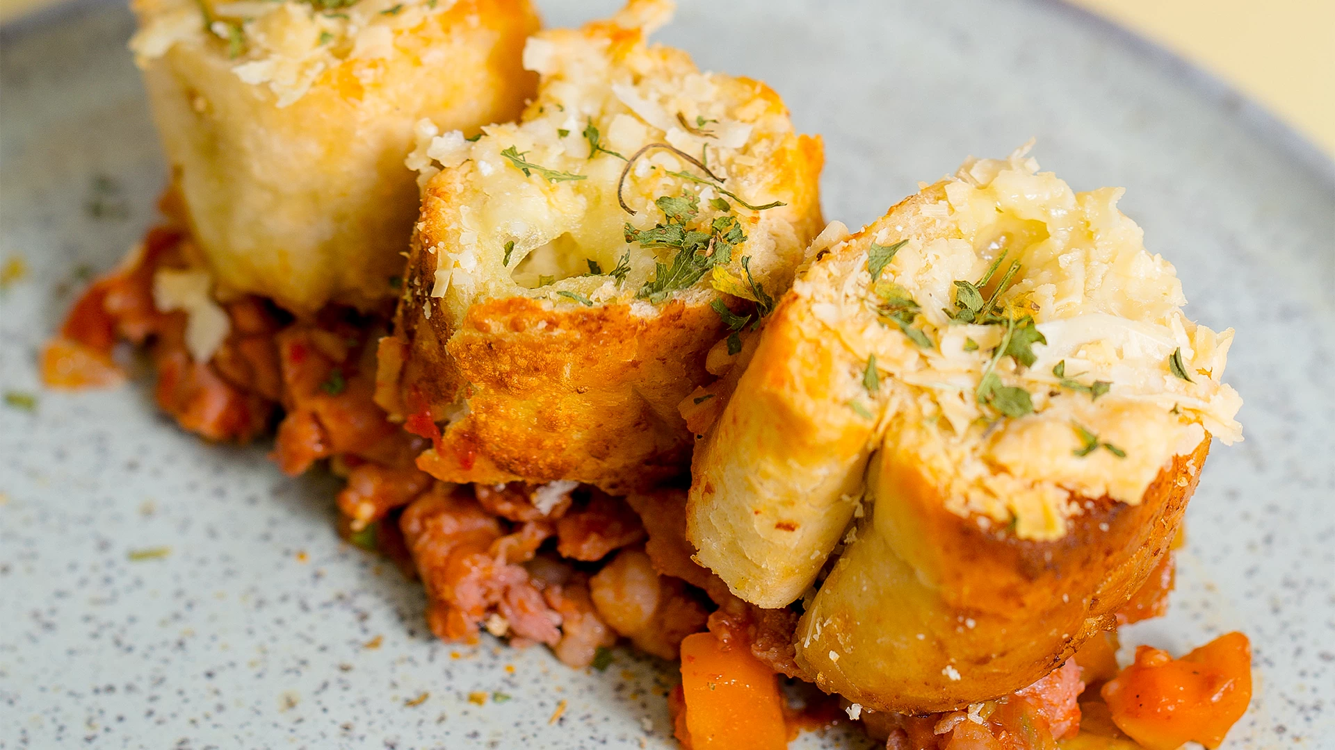 Coloque o ragu em um refratário, disponha o pão de alho por cima, acrescente o queijo ralado e leve ao forno para derreter o queijo.
