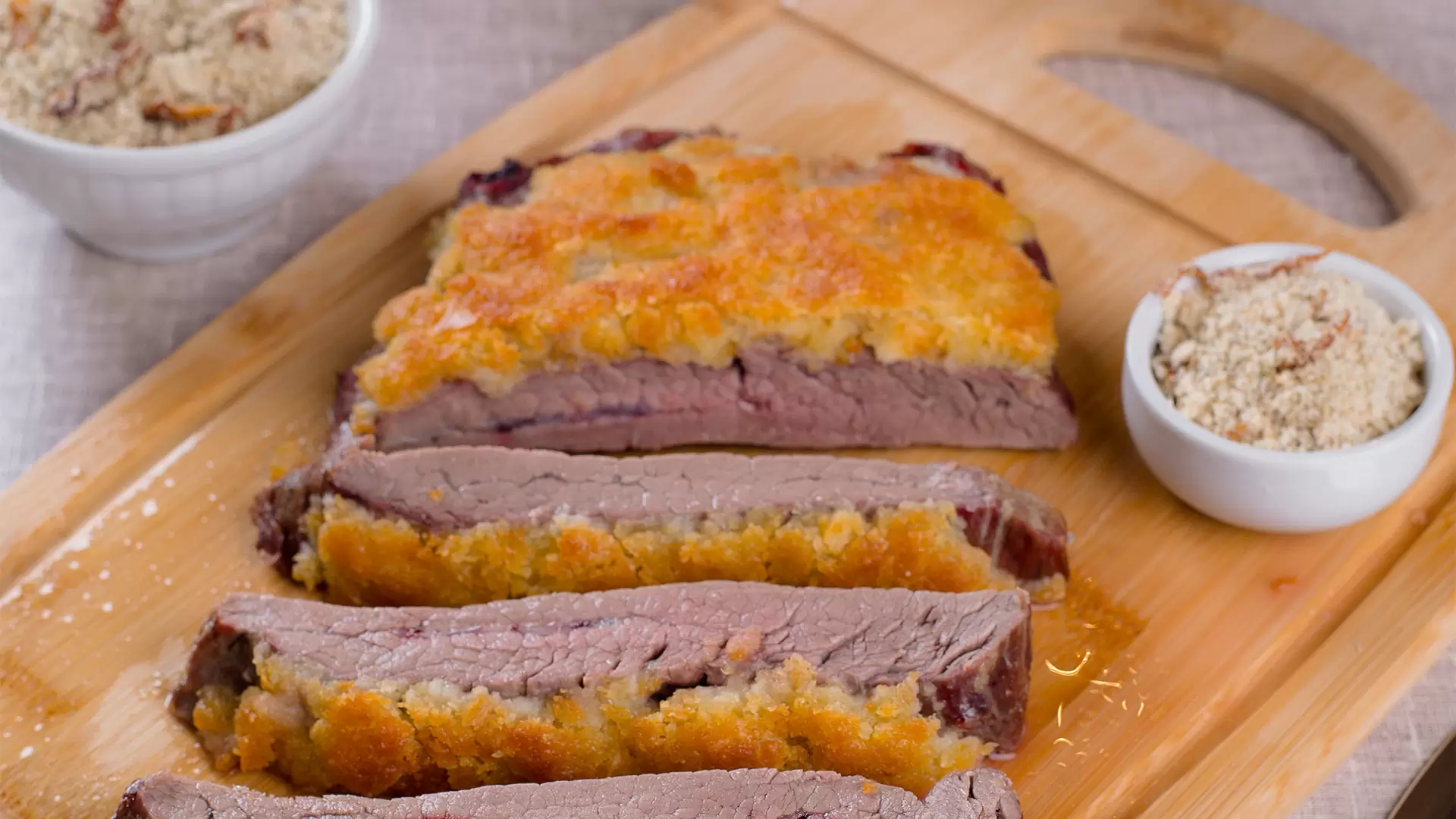 Em um recipiente, misture o pão ralado com o queijo e a manteiga. Cubra a carne com essa mistura, formando uma crosta. Leve para o forno, na função grill, por 15 minutos, até ficar crocante.