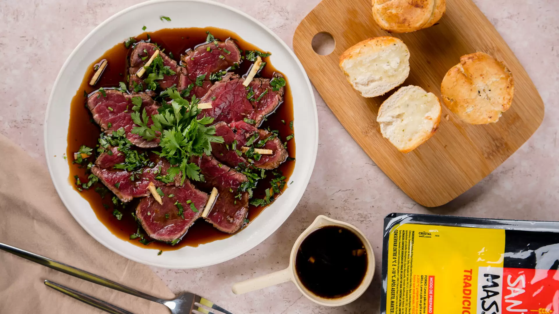 Grelhe a carne em fogo alto, selando bem todos os lados para manter o interior mal passado. Embrulhe em plástico filme e resfrie na geladeira. Combine os ingredientes do molho e misture. Corte a carne em fatias finas, arrume em um prato intercalando as camadas. Regue com o molho, acrescente gengibre e cheiro verde. Sirva com Pão de Alho bolinha Santa Massa.