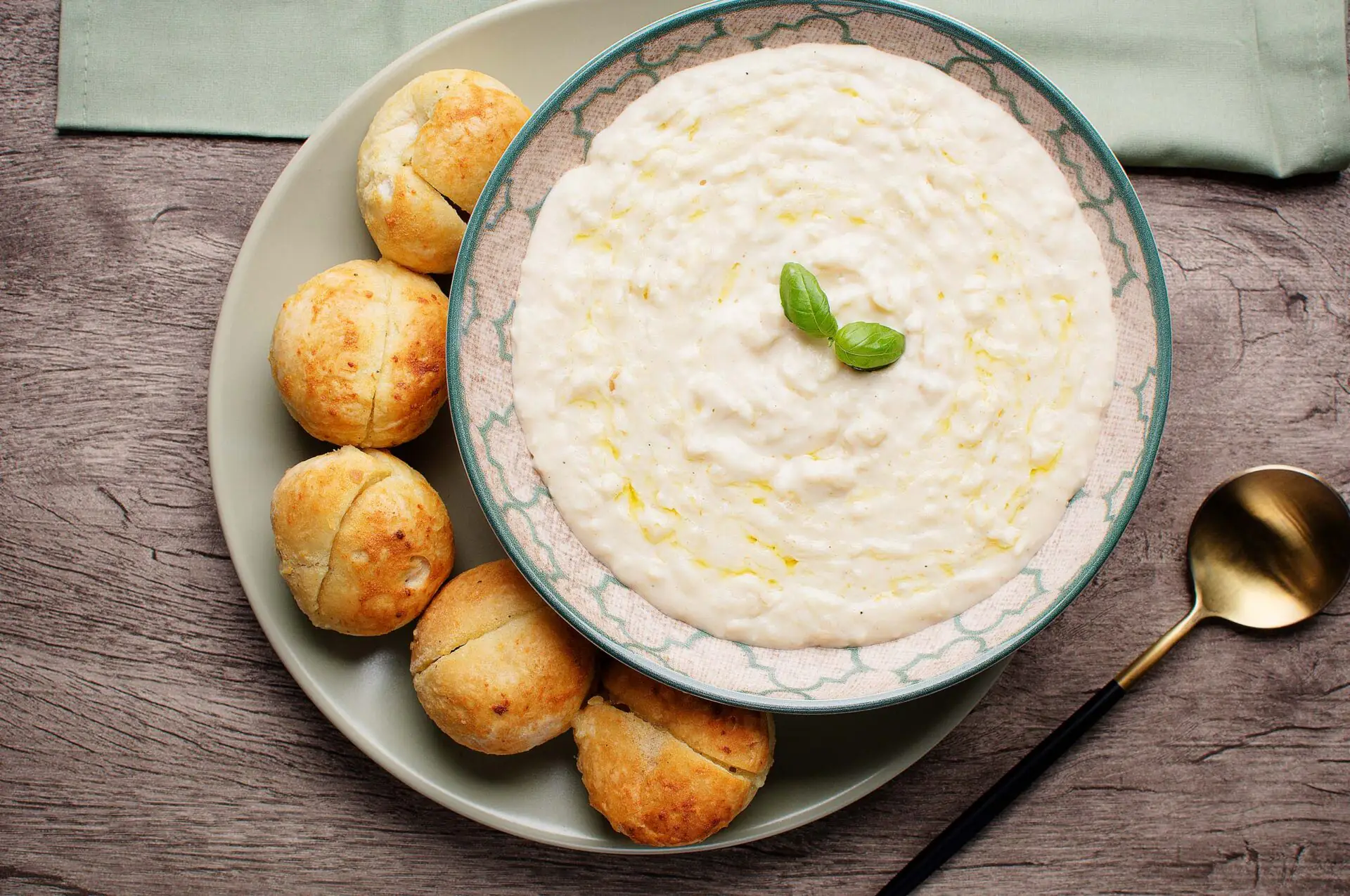 O nosso pão de alho bolinha tradicional fica incrível como acompanhamento para esse Creme de Palmito supercremoso! Assista ao vídeo completo para aprender a fazer.