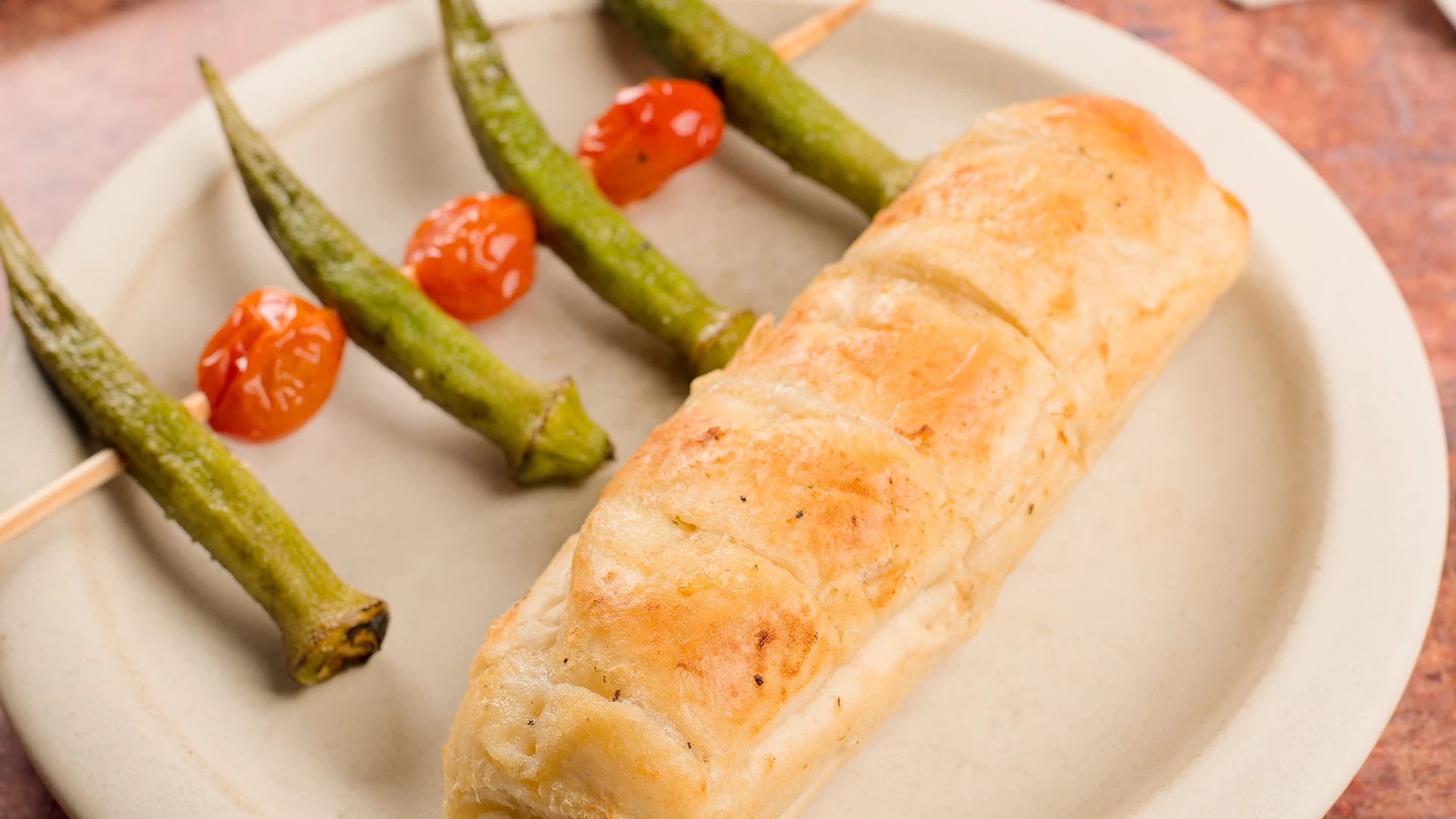 Esse espetinho de quiabo com tomate-cereja acompanhado do Pão de Alho Santa Massa é incrível!