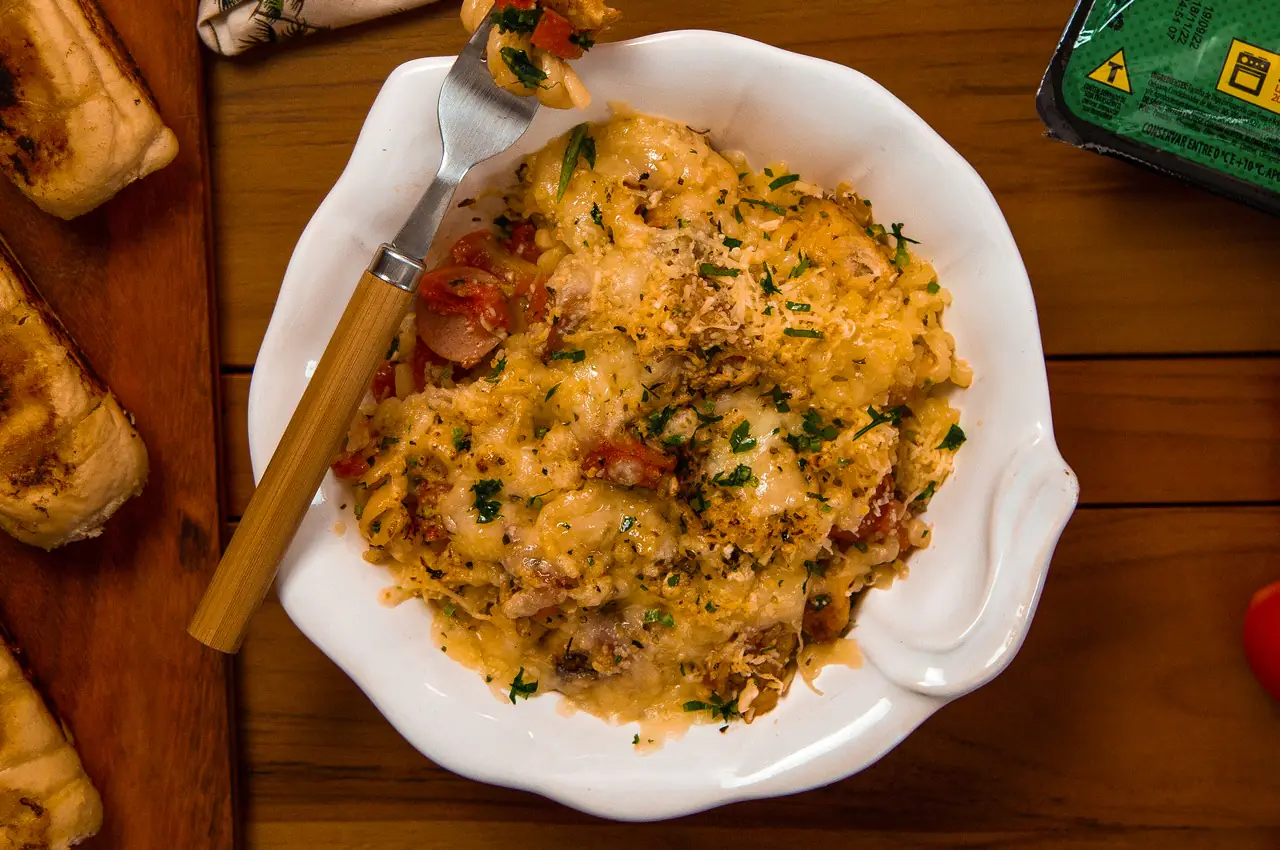 Uma viagem à praia em família precisa ter comida boa, rápida e fácil de fazer. Por isso, nosso chef vai ensinar uma receita deliciosa de macarrão gratinado com salsicha e Pão de Cebola Santa Massa.