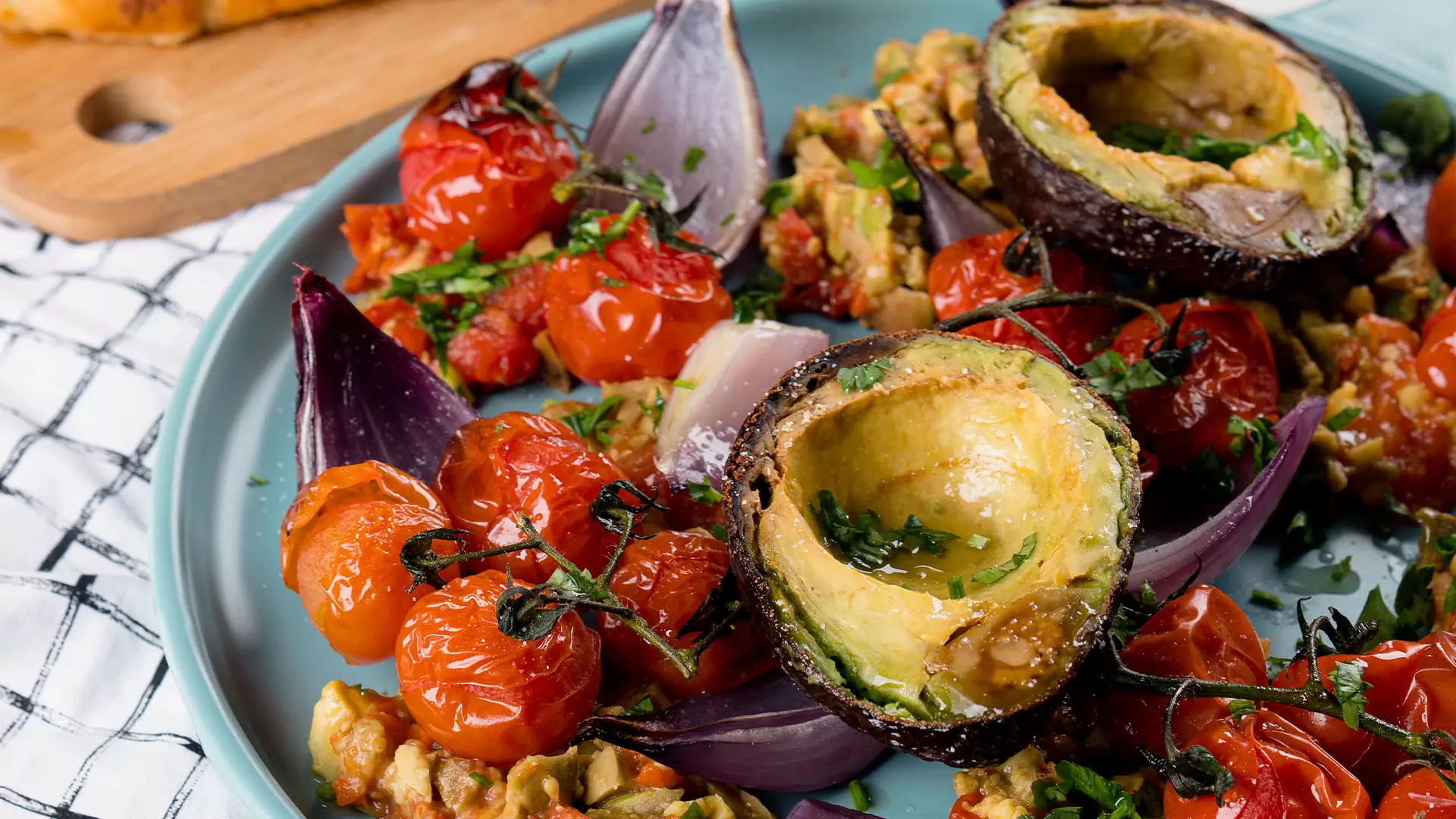 Corte a cebola em quatro pedaços, retire a semente do avocado e leve tudo para uma assadeira com furos. Tempere com sal, pimenta do reino e azeite e deixe assar por 20 minutos. Quando estiverem macios, retire as sementes da pimenta, corte em cubos e pique bem com parte dos tomates e avocados.